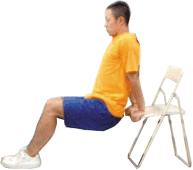 後ろ向きで椅子に手をつき、両足を揃え、膝を伸ばして、手と踵で体重を支え、バランスをとります。この時、体が一本の線にならないように、少し腰を下に落とします。(上体と脚がL字を描くようにします) |